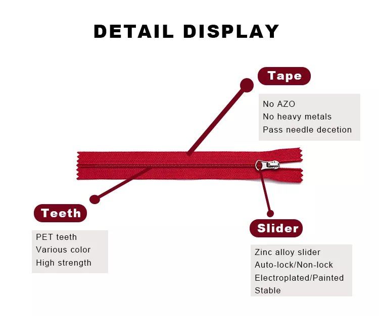 Le cerniere in nylon standard TRC sono realizzate con cura in poliestere di alta qualità e denti in nylon ad alta resistenza. Il loro design leggero ma robusto garantisce apertura e chiusura fluide, oltre a un'eccellente durata. Tra le cerniere più utilizzate, questo prodotto offre una durata eccezionale e una sensazione liscia come la seta, che lo rende ideale per abbigliamento, valigie, biancheria e attrezzature per esterni.